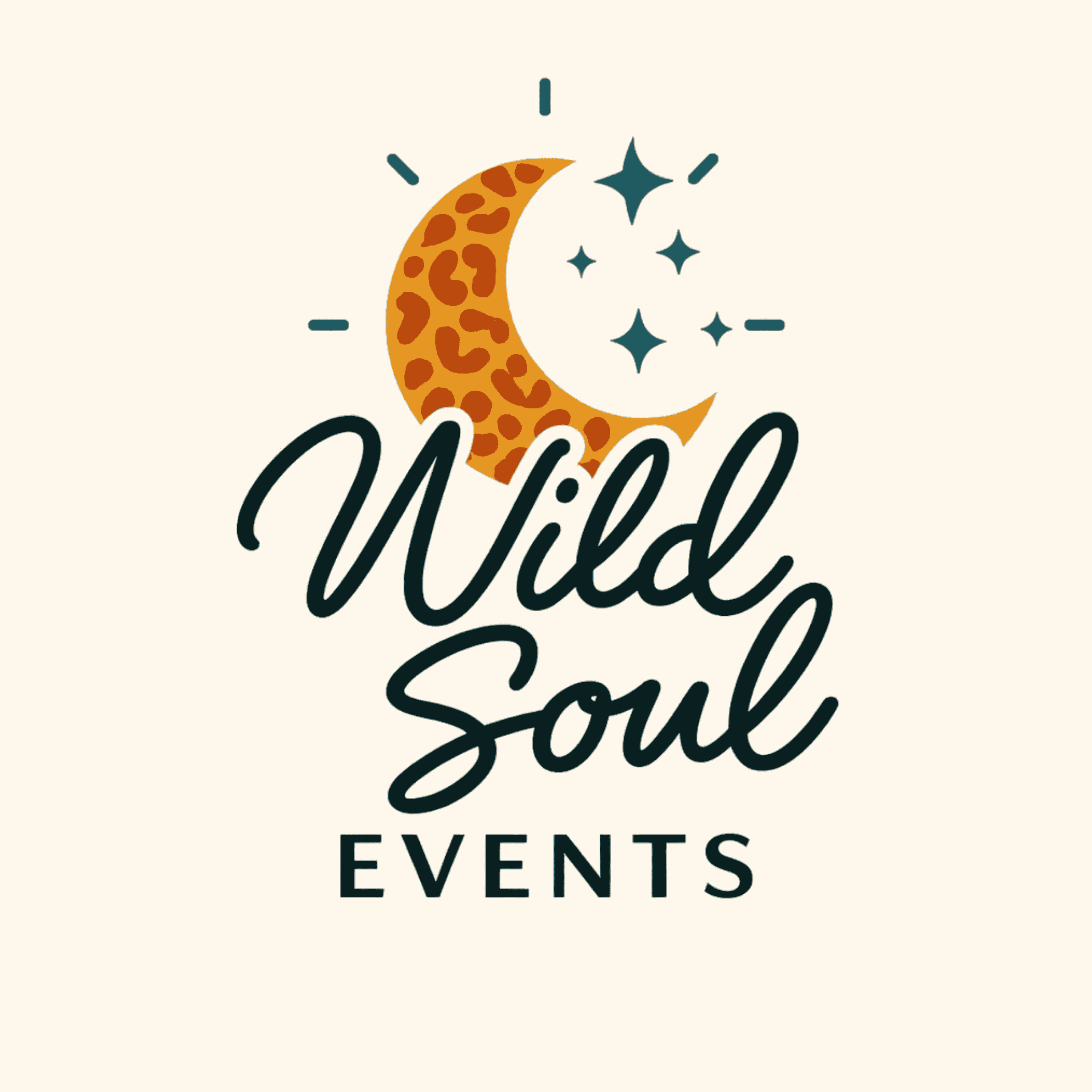 Logo for Wild Soul Events featuring a leopard-print crescent moon, stars, and cursive text.